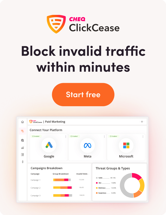 CHEQ Essentials uses the most advanced processes to block bad bot traffic in real time. This means that click fraud traffic, such as click farms or other non-human traffic, cannot click on your PPC ads.