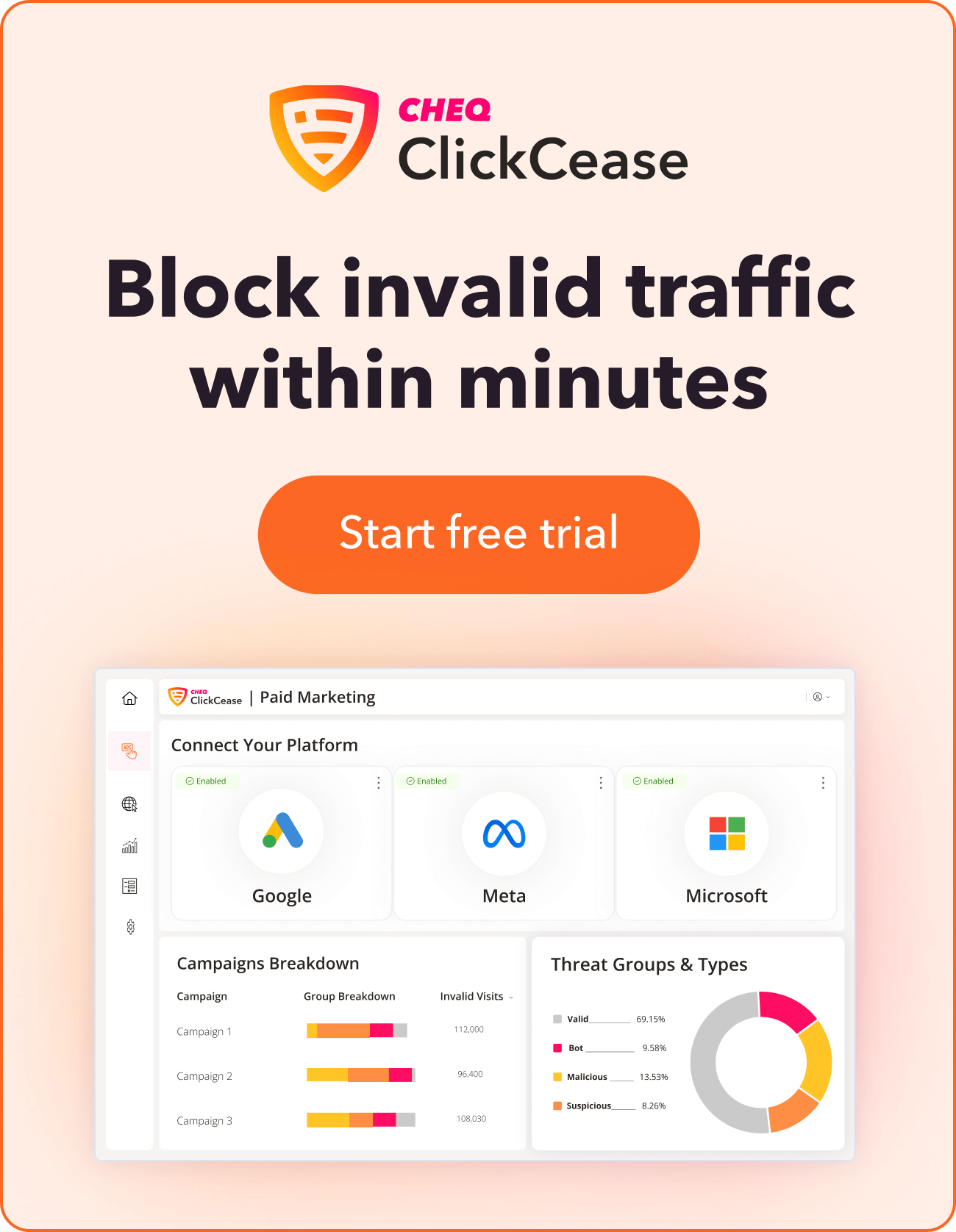 CHEQ Essentials uses the most advanced processes to block bad bot traffic in real time. This means that click fraud traffic, such as click farms or other non-human traffic, cannot click on your PPC ads.