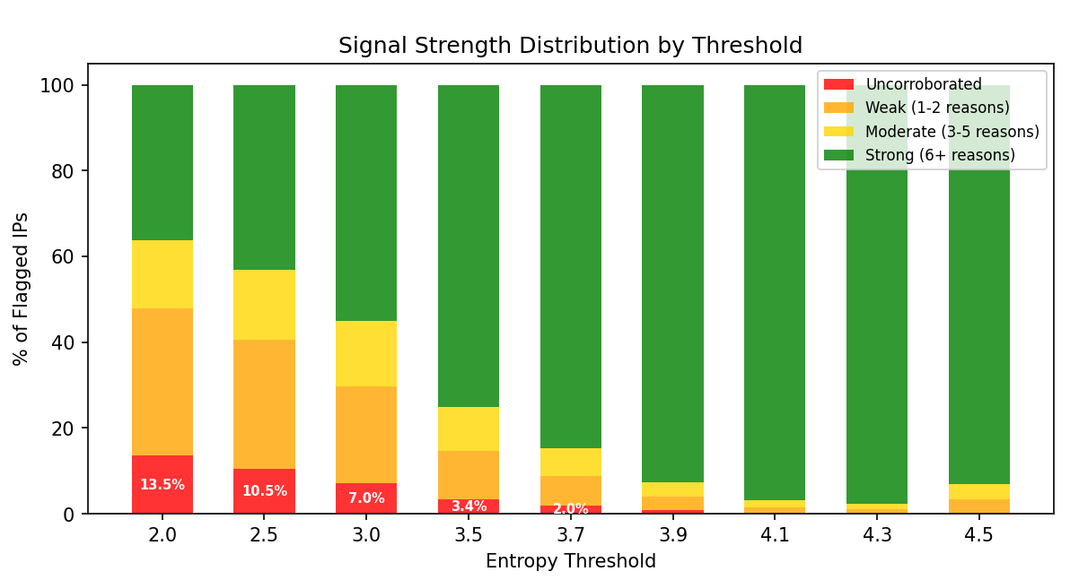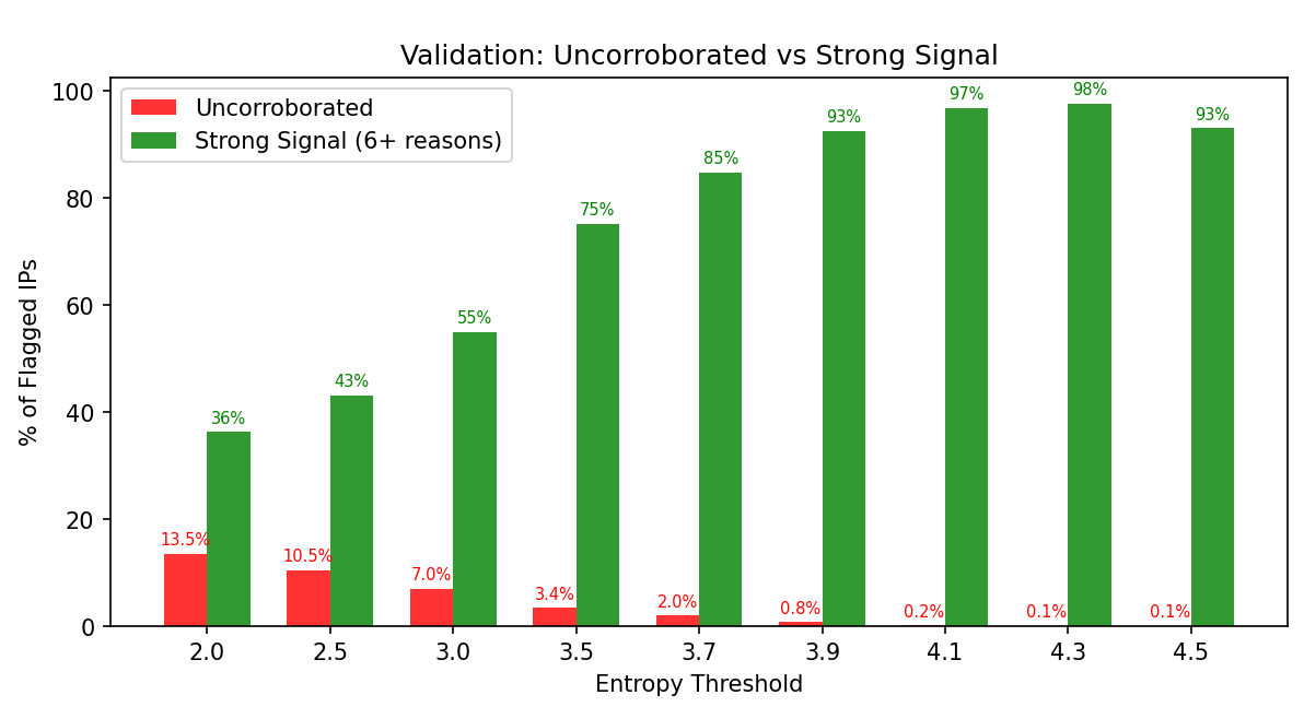 1. Corroboration Rate: What percentage of flagged IPs have independent signals confirming them? Higher is better – it means entropy detection aligns with established methods.