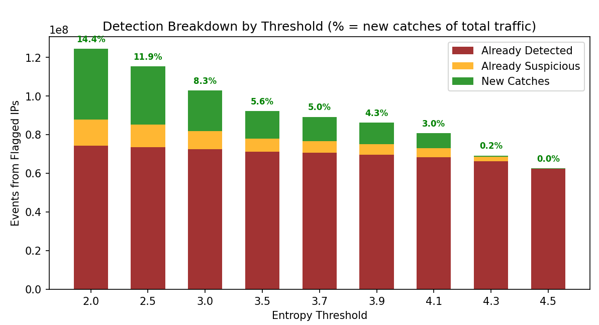 The green “New Catches” segment represents traffic from IPs flagged by entropy that weren’t already detected by other methods – the unique value add of temporal analysis.