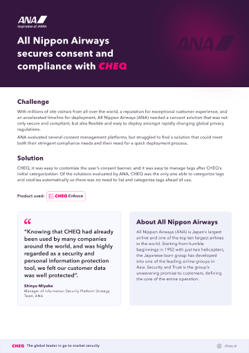 - ANA evaluated several consent management platforms, but struggled to find a solution that could meet both their stringent compliance needs and their need for a quick deployment process. That’s where CHEQ came in.