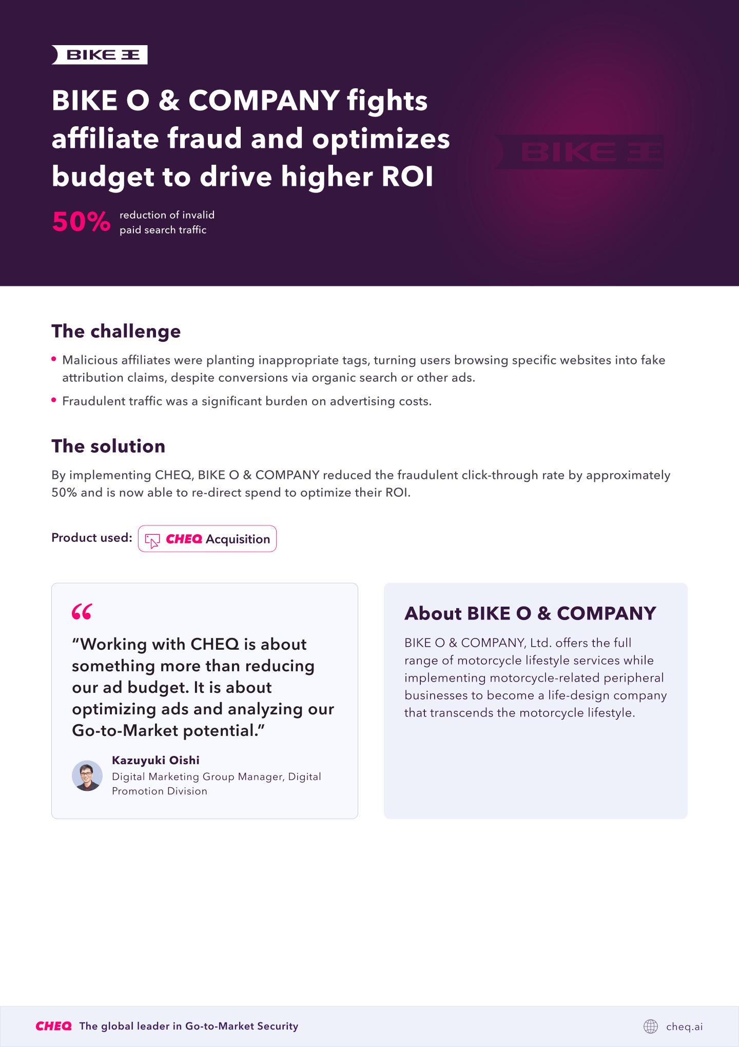 By implementing CHEQ, BIKE O & COMPANY reduced their fraudulent click-through rate by approximately 50% and is now able to redirect spend to optimize their ROI.