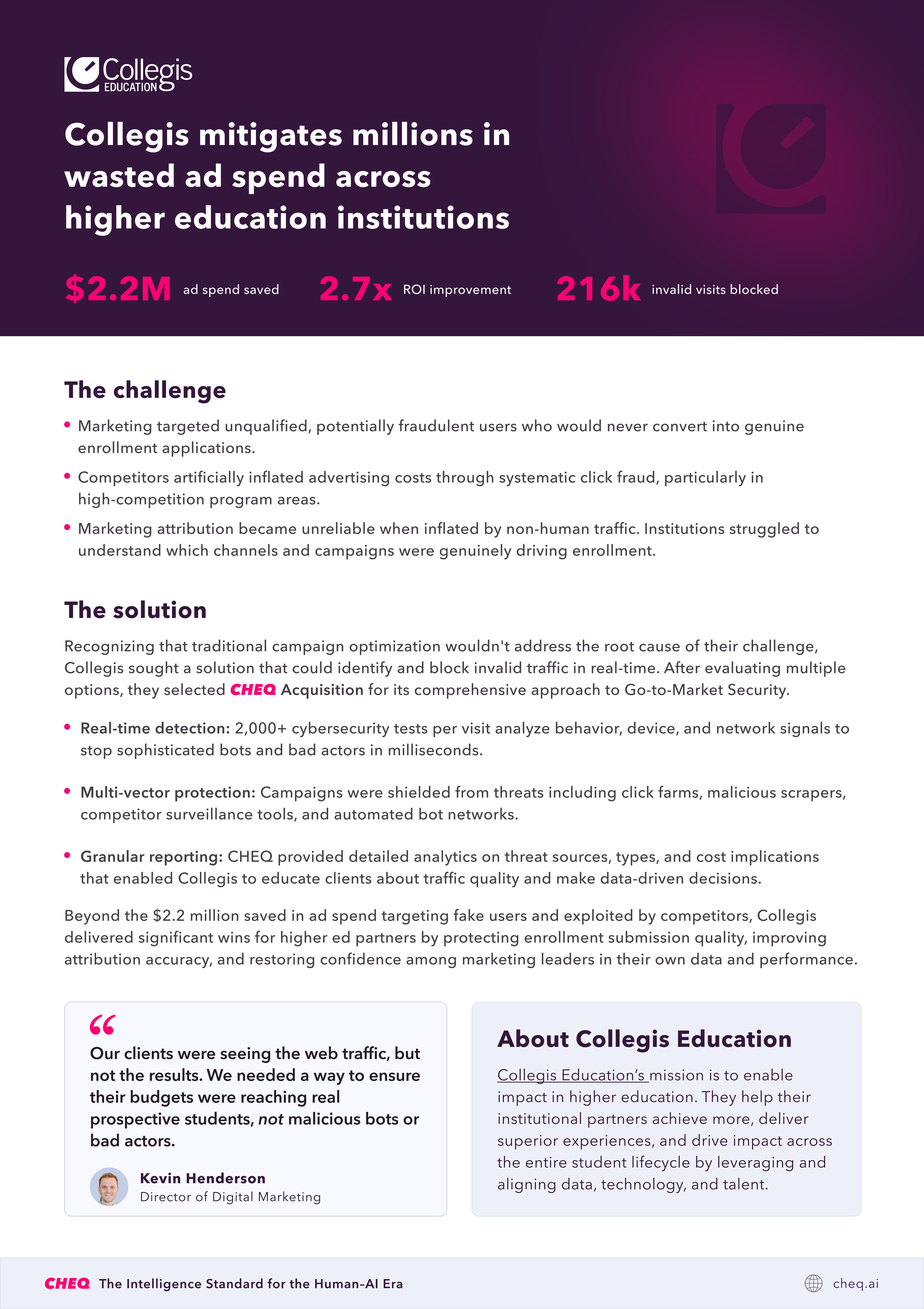 Recognizing that traditional campaign optimization wouldn’t address the root cause of their challenge, Collegis sought a solution that could identify and block invalid traffic in real-time. After evaluating multiple options, they selected CHEQ Acquisition for its comprehensive approach to Go-to-Market Security.