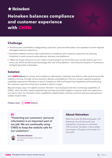 With CHEQ Enforce for privacy and compliance enforcement, Heineken was able to unify consent across the customer journey, through various domains, devices, and platforms. This one consent applied-anywhere capability empowered Heineken to stay in compliance with evolving privacy regulations while protecting the customer experience they have worked so hard to create.