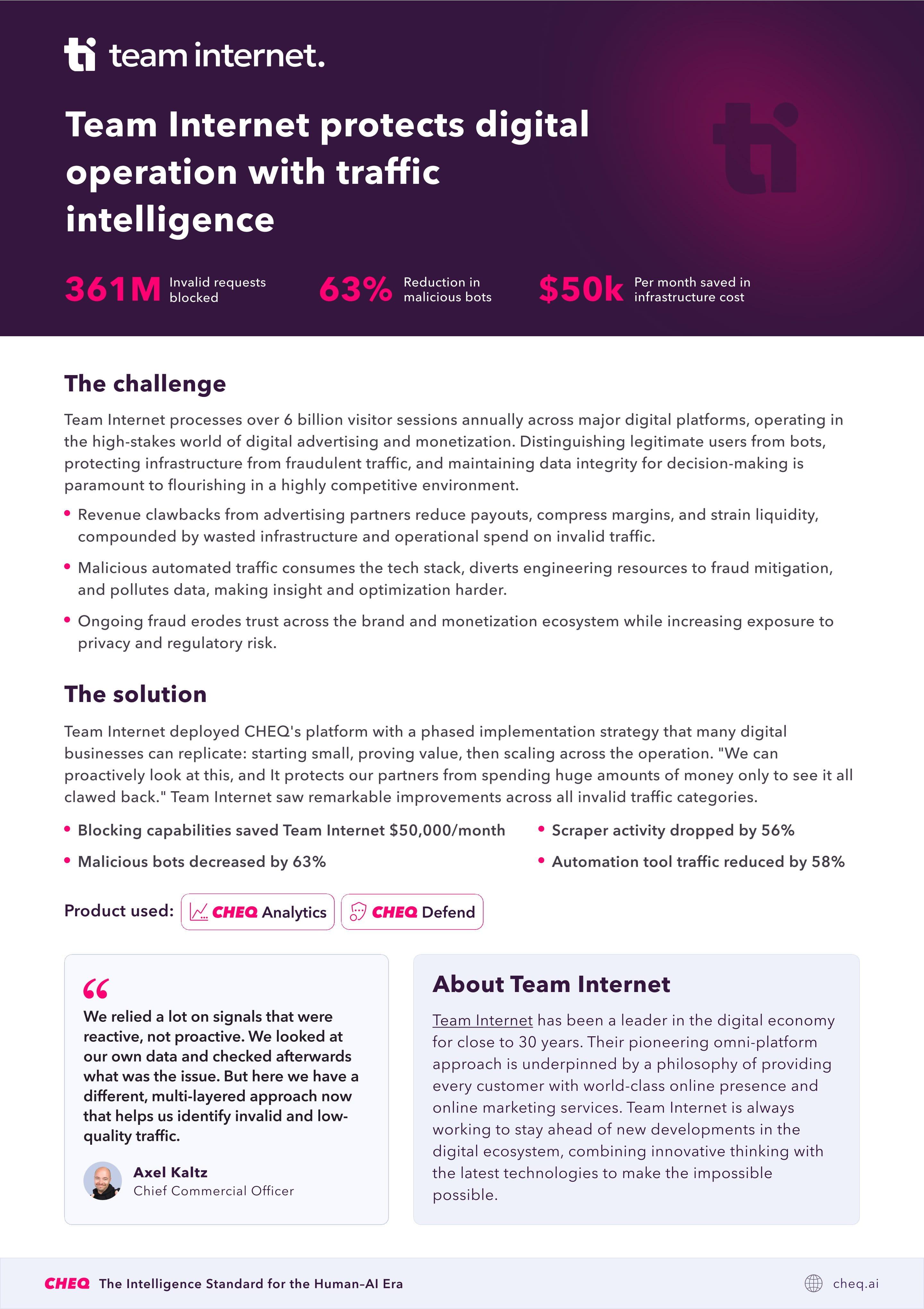 Team Internet deployed CHEQ’s platform with a phased implementation strategy that many digital businesses can replicate: starting small, proving value, then scaling across the operation. “We can proactively look at this, and It protects our partners from spending huge amounts of money only to see it all clawed back.”