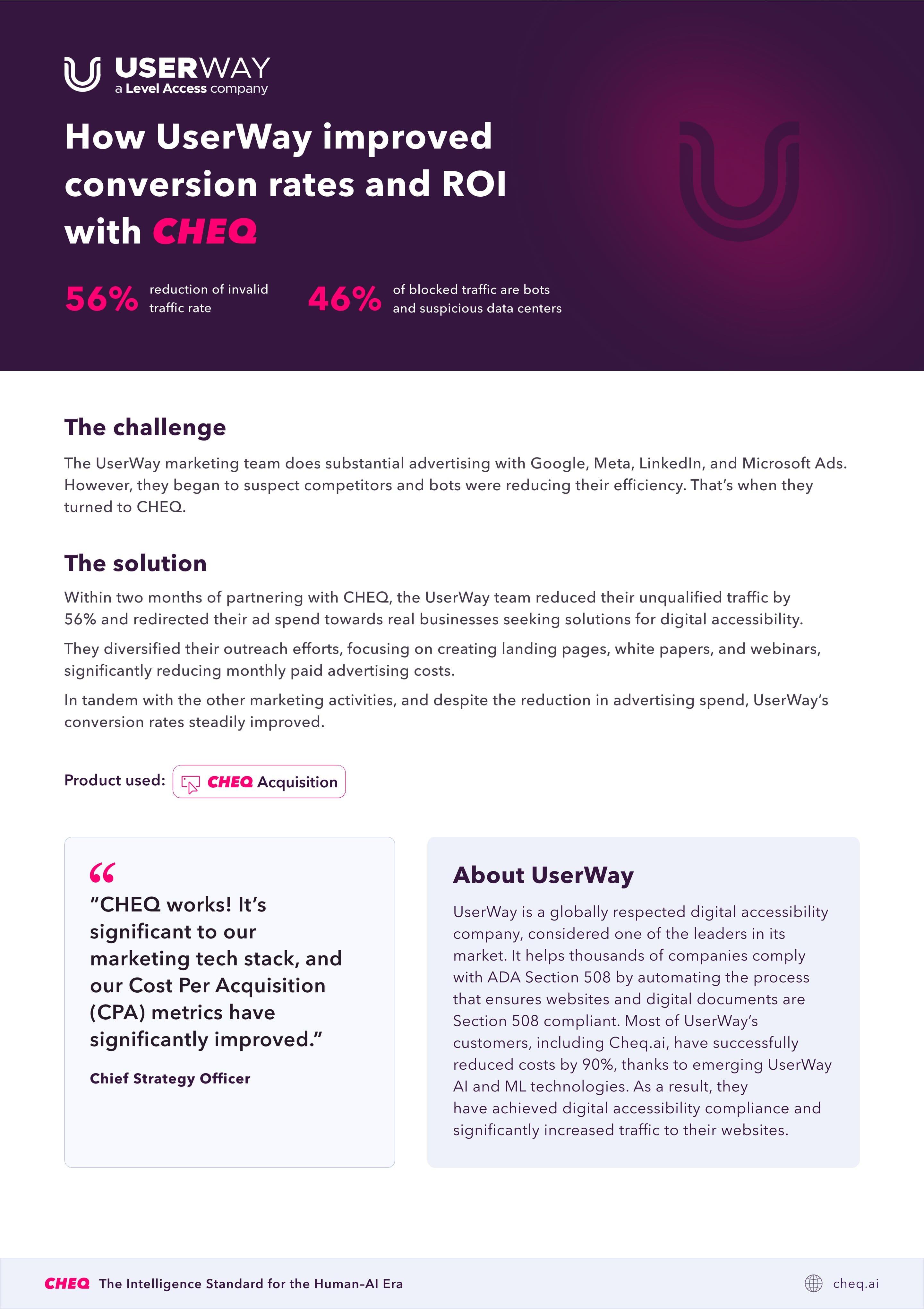 Within two months of partnering with CHEQ, the UserWay team reduced their unqualified traffic by 56% and redirected their ad spend towards real businesses seeking solutions for digital accessibility.